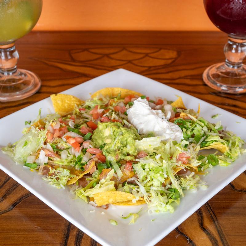 Topped with avocado, lettuce, tomato, sour cream. option of chicken or beef.