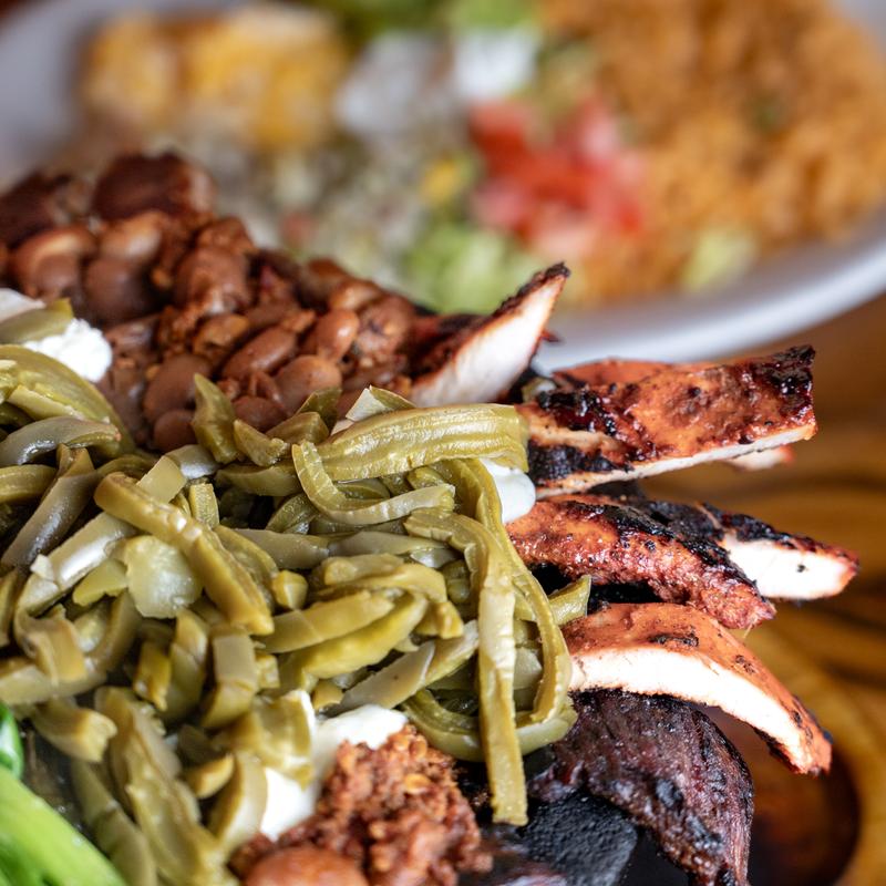 Carne asada, chorizo, beans, pork, pollo asado, queso fresco, nopales, chile toreados, tortillas & rice.