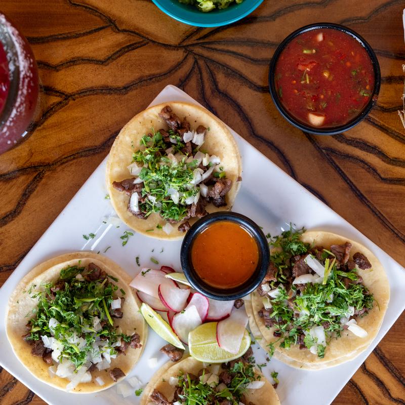 Three tacos, tender beef skirt steak flame broiled, sliced and folded into soft corn tortillas with onions and fresh cilantro and guacamole.